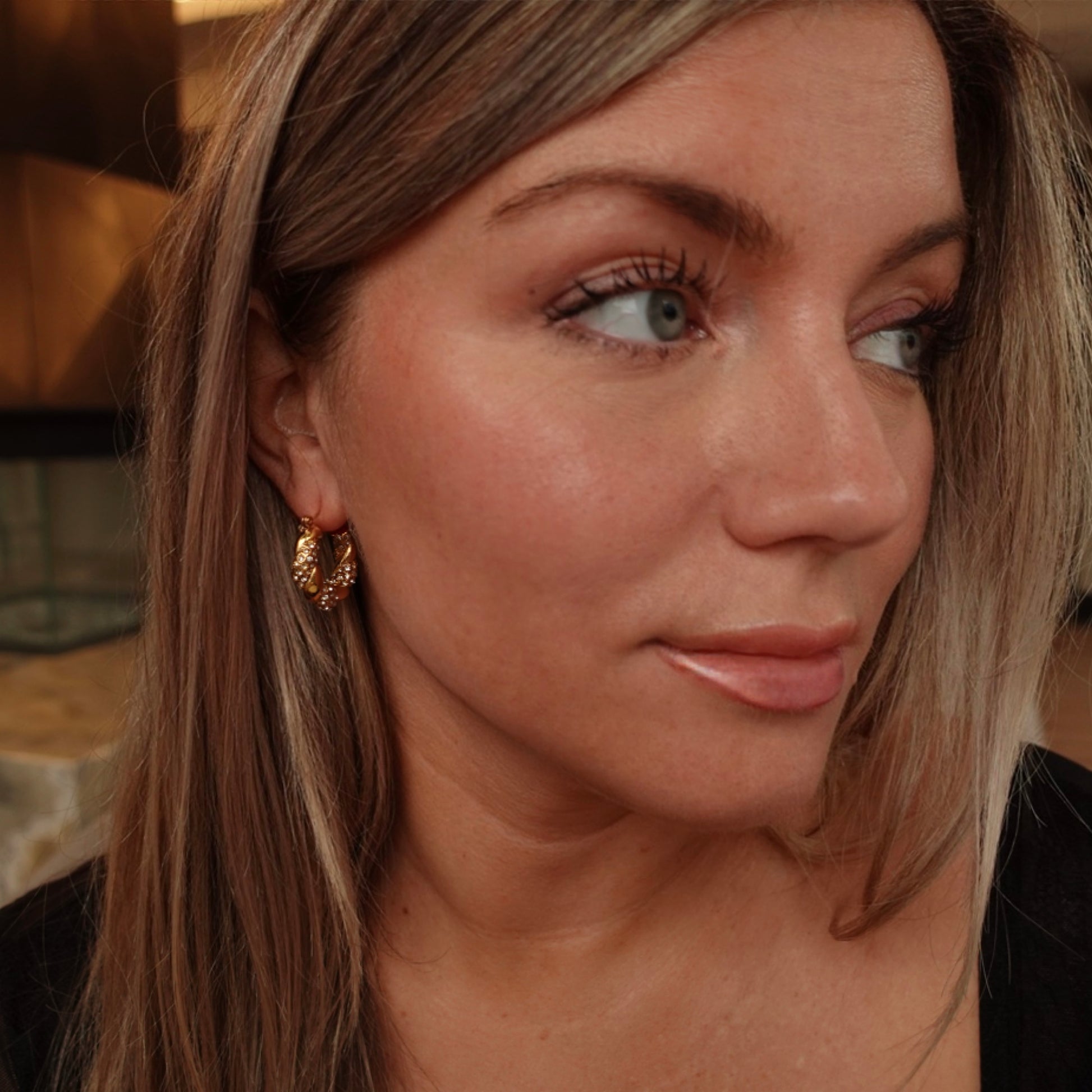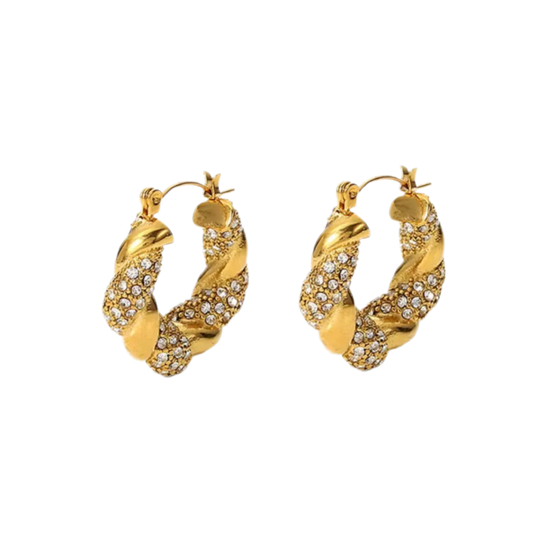 The Belle Earrings feature sculpted hoops with a twist, finished with cubic zirconia for added depth and light. Textural and eye-catching, they make a statement while remaining refined.