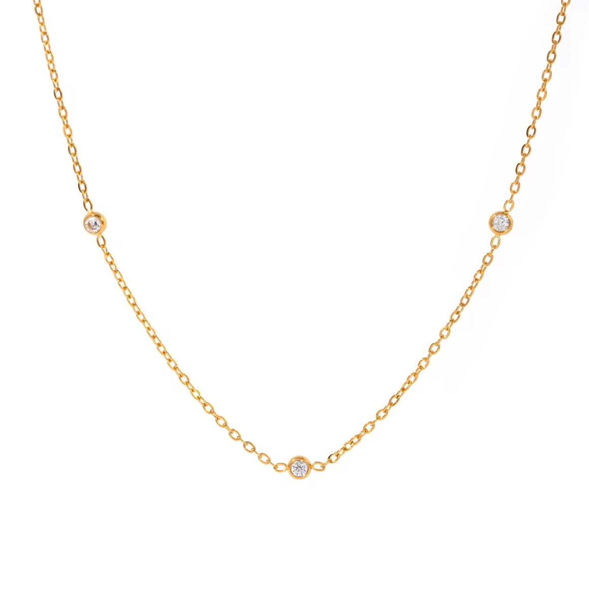 The Clara Necklace features a delicate chain adorned with sparkling cubic zirconia accents, creating a refined glimmer that catches the light beautifully. Measuring 15.7 inches with a 2-inch extender, it’s designed for effortless everyday wear or to add a subtle touch of sophistication to any look. Crafted from 18K gold-plated stainless steel. Pair it with the Hallie Bracelet to complete a coordinated, refined set.